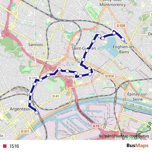 The first stop of the 1516 bus route is Gare d'Argenteuil and the last stop is Gare d'Enghien-les-Bains. 1516 is operational during everyday.