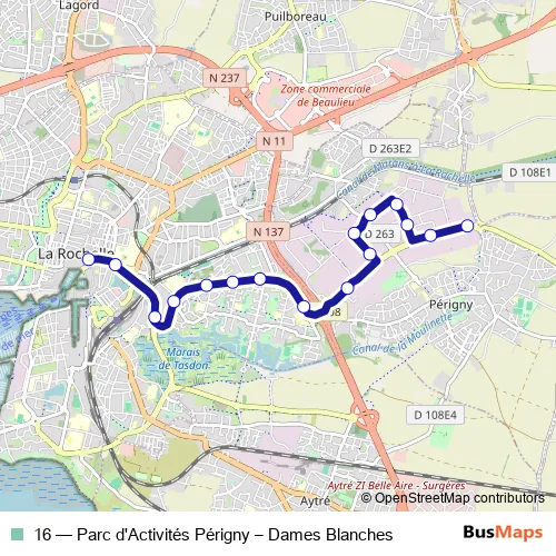 Bus 16 - Parc d'Activités Périgny – Dames Blanches in La Rochelle: Stops & Timetable
