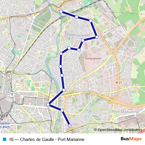 The first stop of the 16 bus route is Charles de Gaulle and the last stop is Port Marianne. 16 (Charles de Gaulle - Port Marianne) is operational during everyday.