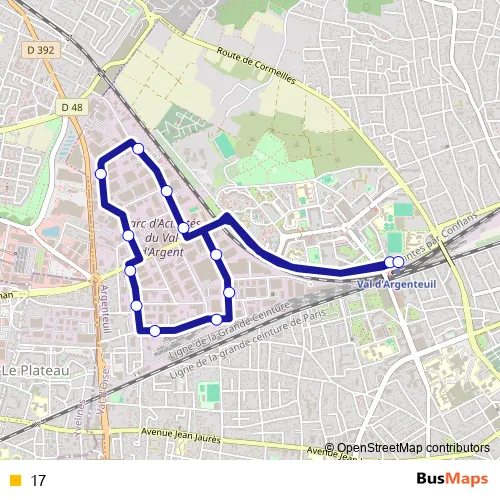 The first stop of the 17 bus route is Gare du Val d'Argenteuil and the last stop is Gare du Val d'Argenteuil. 17 is operational during on weekdays.