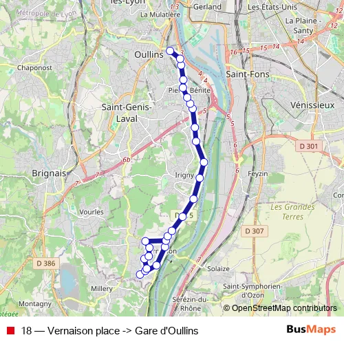 The first stop of the 18 bus route is Vernaison place and the last stop is Gare d'Oullins. 18 (Vernaison place -> Gare d'Oullins) is operational during everyday.