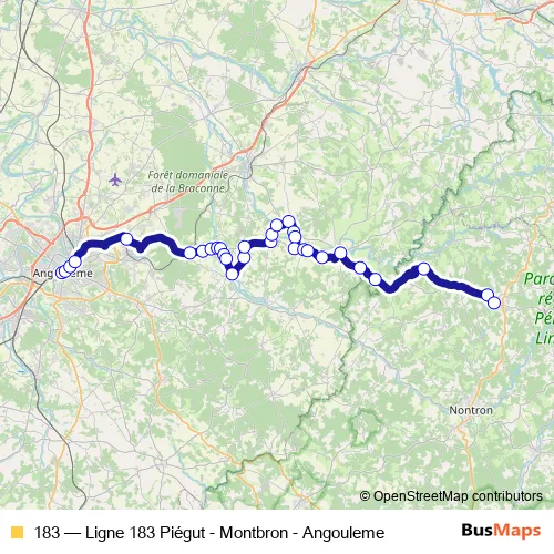 The first stop of the 183 bus route is Angouleme-Hotel DE Ville and the last stop is Piegut-Bourg Place du Minage. 183 (Ligne 183 Piégut - Montbron - Angouleme) is operational during everyday.