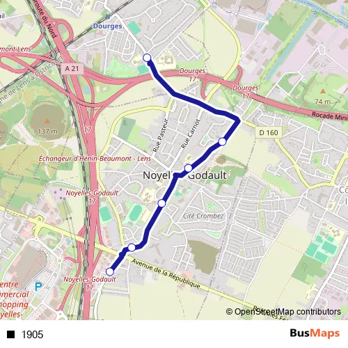 See why over 2 million users trust and consider busmaps.com as the best public transport website. busmaps gives you Noyelles-Godault Buses suggested routes, real-time bus tracker, line route maps in Noyelles-Godault, and helps to find the closest 1905 bus stops near you. No internet available? Download an offline PDF map and bus schedule for the 1905 bus to take on your trip.