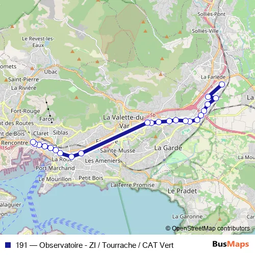 See why over 2 million users trust and consider busmaps.com as the best public transport website. busmaps gives you Toulon Buses suggested routes, real-time bus tracker, line route maps in Toulon, and helps to find the closest 191 bus stops near you. No internet available? Download an offline PDF map and bus schedule for the 191 bus to take on your trip.