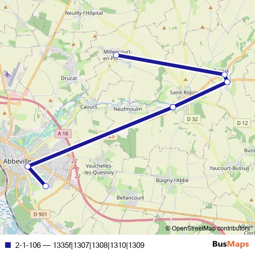 The first stop of the 2-1-106 bus route is Millencourt-EN-Ponthieu - Centre and the last stop is Abbeville - Collège Ponthieu. 2-1-106 (1335f|1307|1308|1310|1309) is operational during everyday.