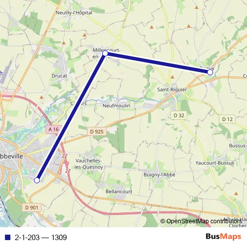 The first stop of the 2-1-203 bus route is Abbeville - Collège Ponthieu and the last stop is Oneux - Mairie. 2-1-203 (1309) is operational during everyday.