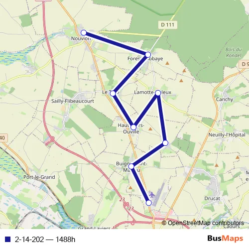 The first stop of the 2-14-202 bus route is Nouvion - Collège Jacques Prévert and the last stop is Buigny-Saint-Maclou - Aérodrome. 2-14-202 (1488h) is operational during everyday.
