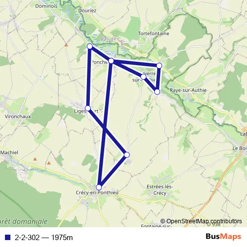 The first stop of the 2-2-302 bus route is Ponches-Estruval - Mairie and the last stop is Ponches-Estruval - Mairie. 2-2-302 (1975m) is operational during everyday.