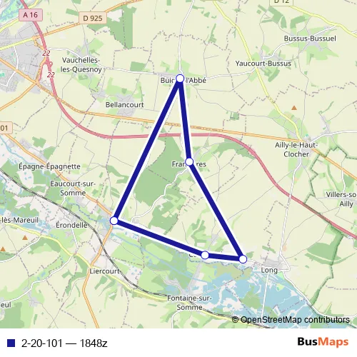 The first stop of the 2-20-101 bus route is Pont-Remy - Ecole primaire Robert Mallet and the last stop is Pont-Remy - Ecole primaire Robert Mallet. 2-20-101 (1848z) is operational during everyday.