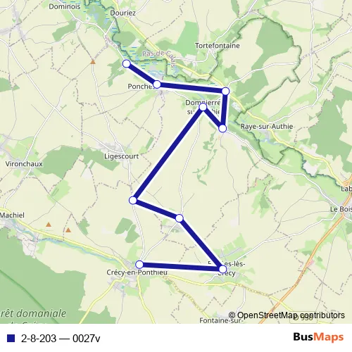 The first stop of the 2-8-203 bus route is Crecy-EN-Ponthieu - Collège Jules Roy and the last stop is Ponches-Estruval - Hameau Estruval. 2-8-203 (0027v) is operational during everyday.