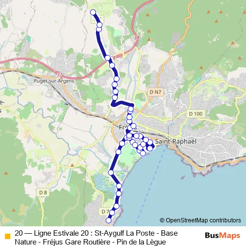 The first stop of the 20 bus route is Saint-Aygulf La Poste (Côté Est) and the last stop is Pin de la Lègue. 20 (Ligne Estivale 20 : St-Aygulf La Poste - Base Nature - Fréjus Gare Routière - Pin de la Lègue) is operational during everyday.