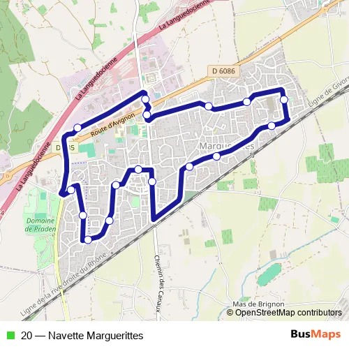 The first stop of the 20 bus route is Marguerittes and the last stop is Marguerittes. 20 (Navette Marguerittes) is operational during everyday.