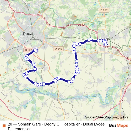 The first stop of the 20 bus route is Centre Hospitalier and the last stop is Pasteur Parking - Somain. 20 (Somain Gare - Dechy C. Hospitalier - Douai Lycée E. Lemonnier) is operational during everyday.