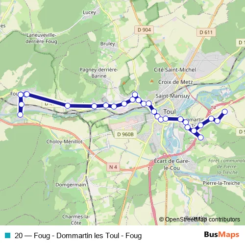 The first stop of the 20 bus route is Foug - Leclerc and the last stop is Dommartin - EPI Grand Est. 20 (Foug - Dommartin les Toul - Foug) is operational during everyday.