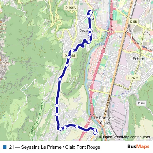 The first stop of the 21 bus route is Seyssins, Le Prisme and the last stop is Claix, Pont Rouge. 21 (Seyssins Le Prisme / Claix Pont Rouge) is operational during everyday.