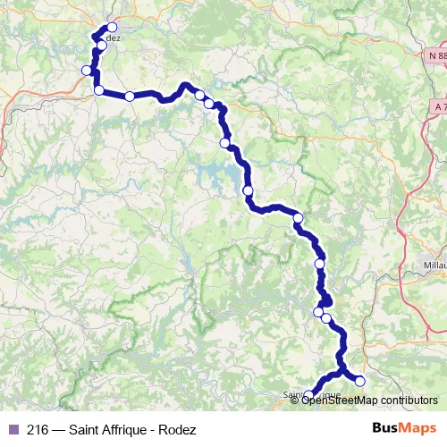 The first stop of the 216 bus route is Rodez - Gare Sncf/Routière and the last stop is Saint-Affrique - Gare Routière. 216 (Saint Affrique - Rodez) is operational during on weekdays.