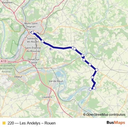 The first stop of the 220 bus route is Gare Routière and the last stop is Petit Andelys. 220 (Les Andelys – Rouen) is operational during everyday.