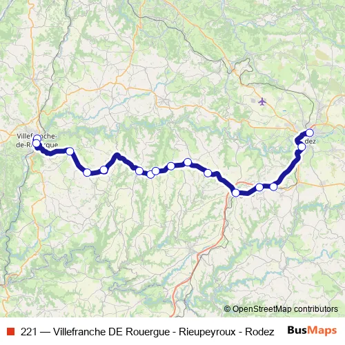 The first stop of the 221 bus route is Villefranche-DE-Rouergue - Pl. la Liberté and the last stop is Rodez - Gare Sncf/Routière. 221 (Villefranche DE Rouergue - Rieupeyroux - Rodez) is operational during on weekdays.