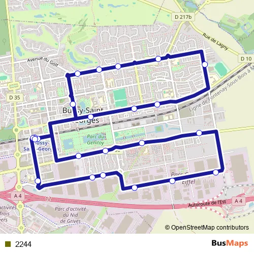The first stop of the 2244 bus route is Gare de Bussy-Saint-Georges and the last stop is Gare de Bussy-Saint-Georges. 2244 is operational during on weekdays.