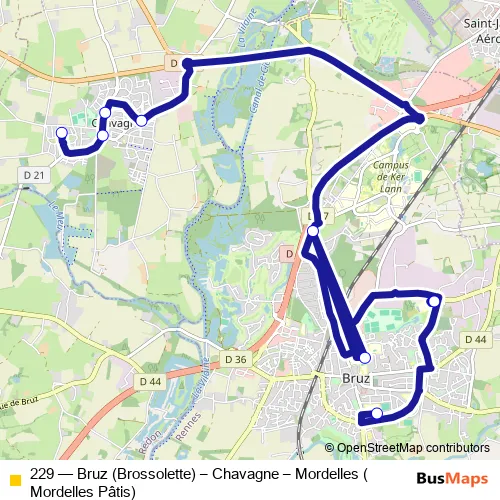 The first stop of the 229 bus route is Brossolette and the last stop is Croix Blanche. 229 (Bruz (Brossolette) – Chavagne – Mordelles (Mordelles Pâtis)) is operational during on weekdays.