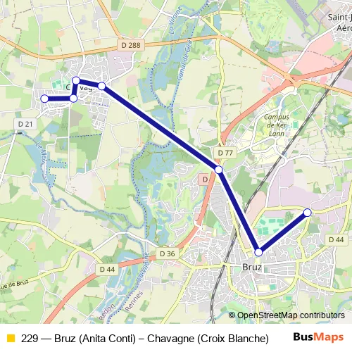 The first stop of the 229 bus route is Croix Blanche and the last stop is Anita Conti. 229 (Bruz (Anita Conti) – Chavagne (Croix Blanche)) is operational during everyday.