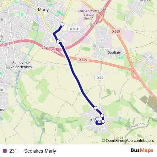 The first stop of the 231 bus route is Preseau Mairie and the last stop is ETS Terroir/Mansart. 231 (Scolaires Marly) is operational during on weekdays.