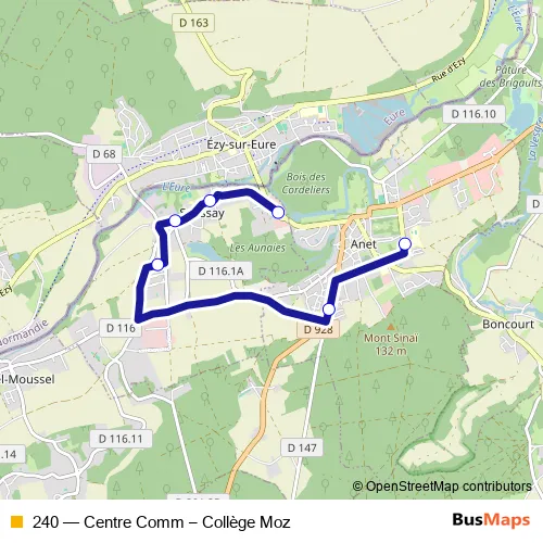 The first stop of the 240 bus route is Centre commercial - Saussay and the last stop is Collège Mozart. 240 (Centre Comm – Collège Moz) is operational during on weekdays.