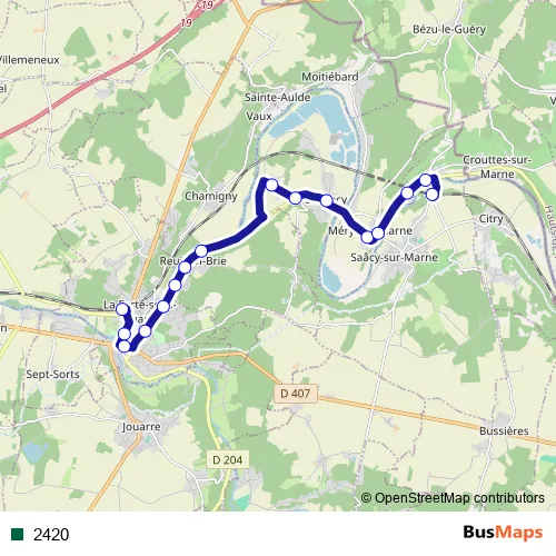 The first stop of the 2420 bus route is Gare de La Ferté-sous-Jouarre (Quai D) and the last stop is Gare de Nanteuil Saâcy. 2420 is operational during everyday.