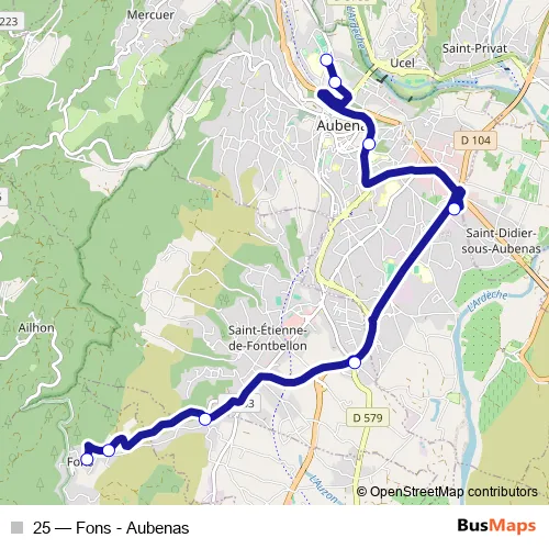 The first stop of the 25 bus route is Fons Les Blaches and the last stop is Place de la Paix. 25 (Fons - Aubenas) is operational during everyday.