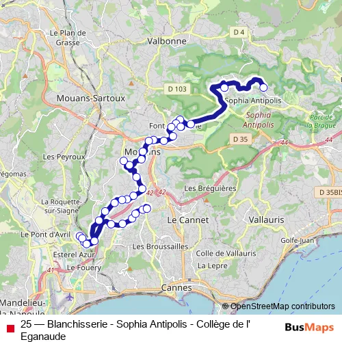 The first stop of the 25 bus route is Collège Eganaude and the last stop is Blanchisserie. 25 (Blanchisserie - Sophia Antipolis - Collège de l'Eganaude) is operational during on weekdays.