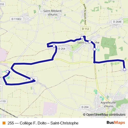 The first stop of the 255 bus route is Collège Françoise Dolto and the last stop is La Panonnière. 255 (Collège F. Dolto – Saint-Christophe) is operational during on weekdays.