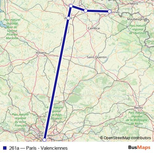 The first stop of the 261a rail route is Paris Gare du Nord and the last stop is Valenciennes. 261a (Paris - Valenciennes) is operational during everyday.