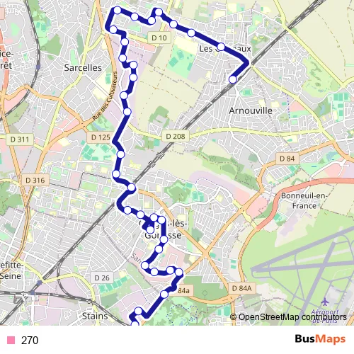 The first stop of the 270 bus route is La Cerisaie and the last stop is Villiers le Bel - Gonesse - Arnouville Rer. 270 is operational during everyday.