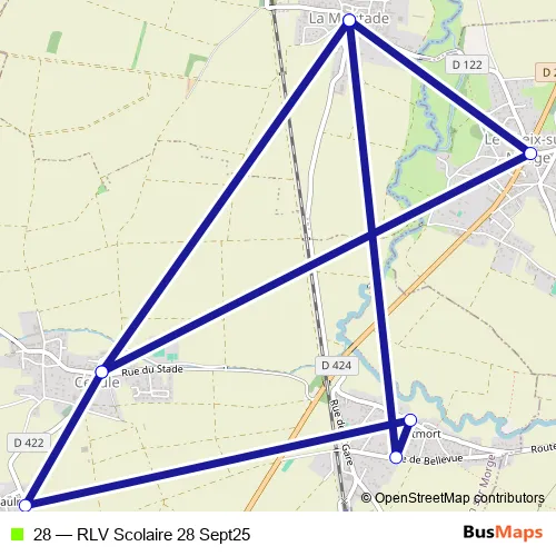 The first stop of the 28 bus route is La Moutade Eglise and the last stop is Place de la Résistance. 28 (RLV Scolaire 28 Sept25) is operational during everyday.