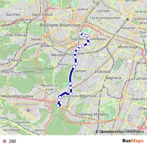 The first stop of the 290 bus route is Issy - Val de Seine and the last stop is La Boursidière. 290 is operational during everyday.
