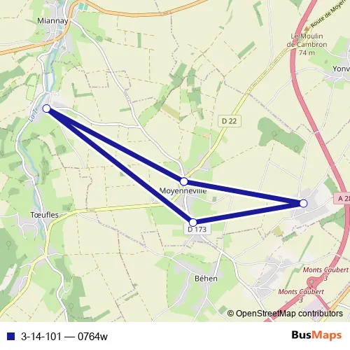 The first stop of the 3-14-101 bus route is Moyenneville - Place de l'Ecole and the last stop is Moyenneville - Place de l'Ecole. 3-14-101 (0764w) is operational during everyday.