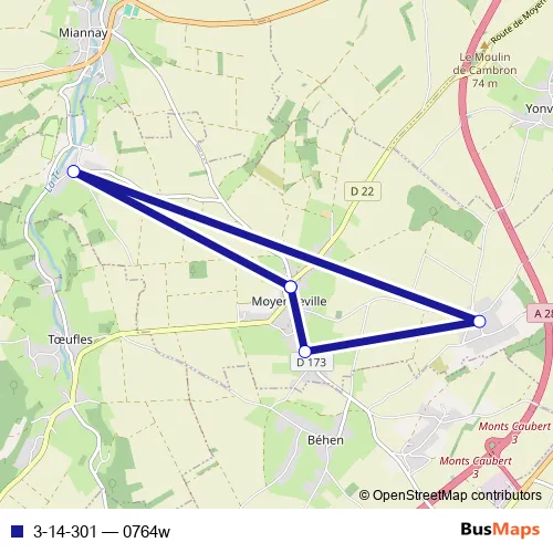 The first stop of the 3-14-301 bus route is Moyenneville - Place de l'Ecole and the last stop is Moyenneville - Place de l'Ecole. 3-14-301 (0764w) is operational during everyday.
