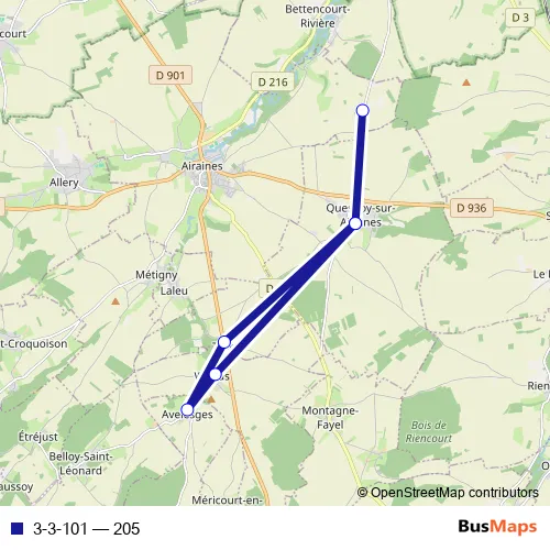 The first stop of the 3-3-101 bus route is Airaines - Ferme du Jardinet and the last stop is Quesnoy-SUR-Airaines - Ecole. 3-3-101 (205) is operational during everyday.
