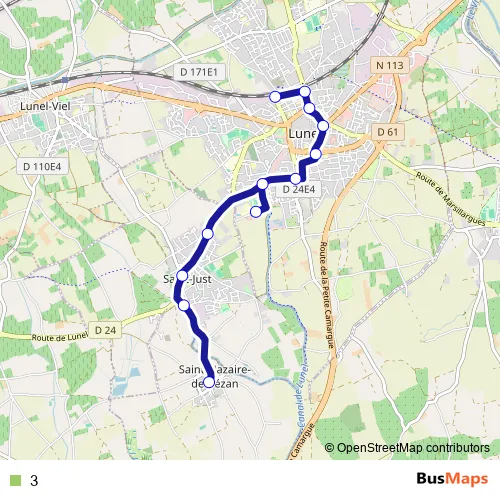 The first stop of the 3 bus route is Saint-Nazaire-DE-Pezan - Centre and the last stop is Lunel - Gare Multimodale [2]. 3 is operational during everyday.
