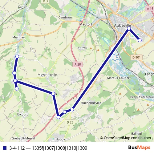 The first stop of the 3-4-112 bus route is Moyenneville - Bouillancourt - Rue du Gué and the last stop is Abbeville - Collège Ponthieu. 3-4-112 (1335f|1307|1308|1310|1309) is operational during everyday.