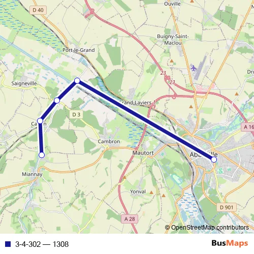 The first stop of the 3-4-302 bus route is Abbeville - Cité scolaire and the last stop is Miannay - Lambercourt - Abri. 3-4-302 (1308) is operational during everyday.