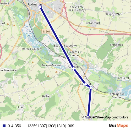 The first stop of the 3-4-356 bus route is Abbeville - Cité scolaire and the last stop is Sorel-EN-Vimeu - Rue de la Terrière. 3-4-356 (1335f|1307|1308|1310|1309) is operational during everyday.