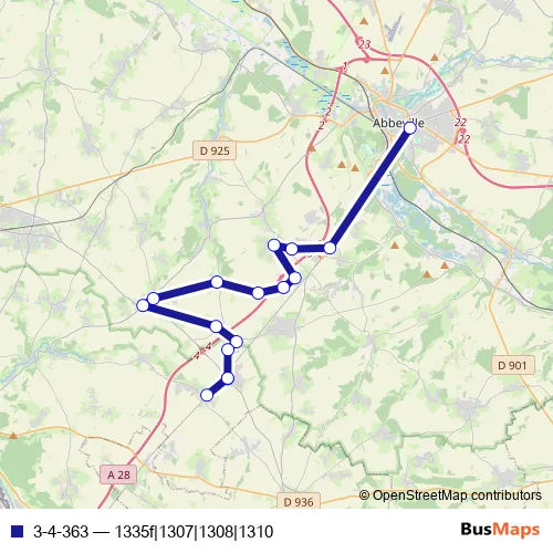 The first stop of the 3-4-363 bus route is Abbeville - Cité scolaire and the last stop is Martainneville - Route Nationale 28. 3-4-363 (1335f|1307|1308|1310) is operational during everyday.