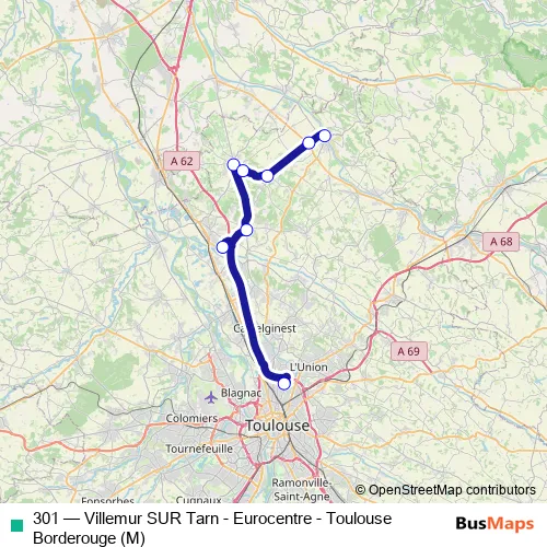 The first stop of the 301 bus route is Toulouse - Borderouge and the last stop is Villemur-SUR-Tarn - Place Saint-Jean. 301 (Villemur SUR Tarn - Eurocentre - Toulouse Borderouge (M)) is operational during on weekdays.