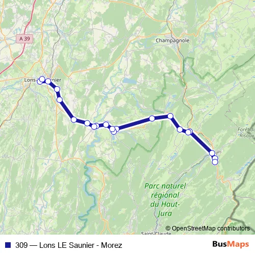 The first stop of the 309 bus route is Morez Gare and the last stop is Lons Avenue Jean Moulin. 309 (Lons LE Saunier - Morez) is operational during everyday.