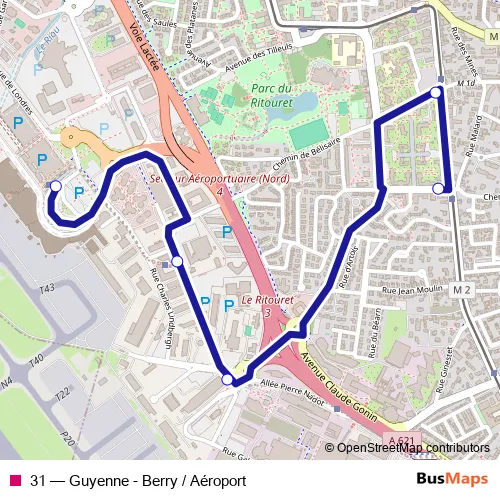 The first stop of the 31 bus route is Aéroport and the last stop is Guyenne-Berry. 31 (Guyenne - Berry / Aéroport) is operational during everyday.
