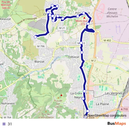 The first stop of the 31 bus route is Les Vignes and the last stop is Blanzat Les Mauvaises. 31 is operational during everyday.