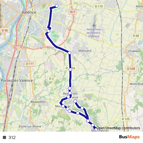 See why over 2 million users trust and consider busmaps.com as the best public transport website. busmaps gives you Valence Buses suggested routes, real-time bus tracker, line route maps in Valence, and helps to find the closest 312 bus stops near you. No internet available? Download an offline PDF map and bus schedule for the 312 bus to take on your trip.