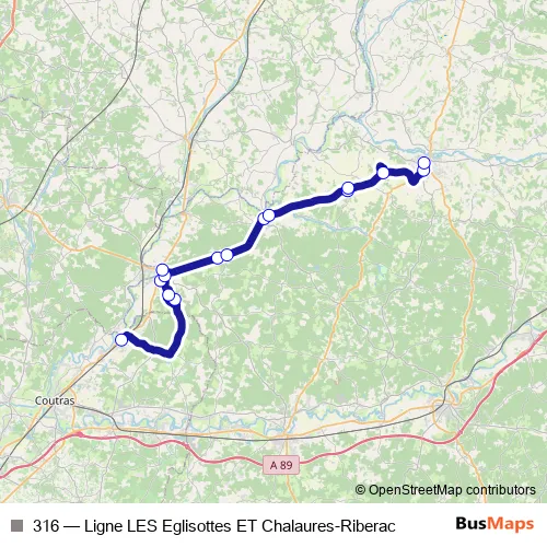 The first stop of the 316 bus route is LR LES Eglisottes-Gare Sncf and the last stop is LR Riberac-Ecole Maternelle. 316 (Ligne LES Eglisottes ET Chalaures-Riberac) is operational during everyday.