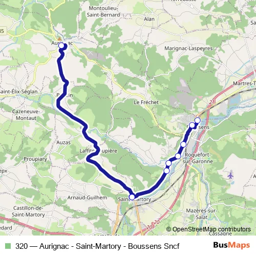 The first stop of the 320 bus route is Aurignac - Ecole Maternelle and the last stop is Boussens - Gare Sncf. 320 (Aurignac - Saint-Martory - Boussens Sncf) is operational during on weekdays.